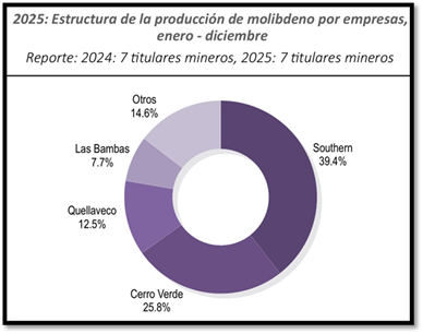 El informe también detalla que la producción acumulada de molibdeno al cierre de 2025 llegó a 38 009 TMF, lo que representa una reducción de 9,4% respecto a las 41 942 TMF registradas en 2024.
